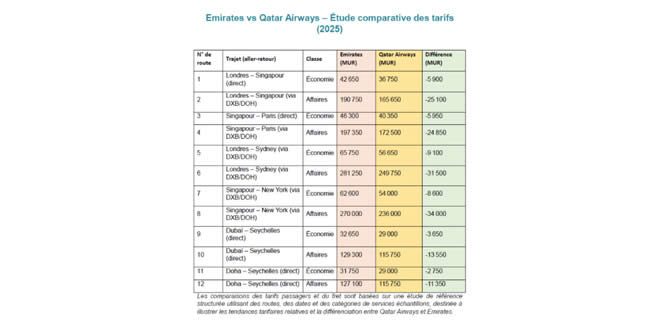 Une étude indépendante réalisée par la firme mauricienne AERONAD Consult Ltd, filiale du Groupe AERONAD spécialisée dans le conseil en gestion aérospatiale et aéronautique, conclut que Qatar Airways propose des tarifs systématiquement inférieurs à ceux d’Emirates sur douze routes internationales majeures. « L’analyse, fondée sur un échantillon de liaisons couvrant l’Europe, l’Asie, l’Australie et l’océan Indien, met en évidence des écarts de prix moyens allant de Rs 2 000 à Rs 9 000 en Classe Économique, et de Rs 20 000 à Rs 30 000 en Classe Affaires », fait ressortir Dr Nadiir Bheekhun, le patron du Groupe AERONAD.